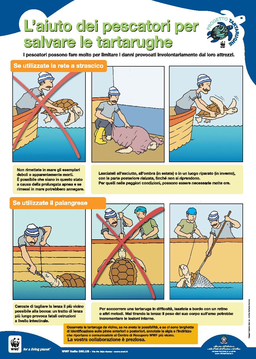 Le tartarughe marine nel Mediterraneo sono vittime di molte minacce più o meno note, come la recentissima moria di almeno 150 individui nelle acque pugliesi negli ultimi due mesi e gli oltre 300 dello scorso anno nel solo alto Adriatico sulle cui cause il dipartimento di veterinaria dell’Università di Padova sta svolgendo indagini scientifiche per identificarne le cause certe. Ma ogni anno si stima che 20.000 tartarughe muoiono lontano dai riflettori, nei soli mari italiani, a causa di una errata gestione da parte dei pescatori che le catturano accidentalmente nelle reti e non sempre riescono a rilasciarle nei modi e nei tempi corretti. Per il questo il WWF lavora da tempo in stretta collaborazione con i pescatori italiani e dell’altra sponda dell’Adriatico per dare a loro tutti gli strumenti di conoscenza utili per salvare migliaia di animali protetti.